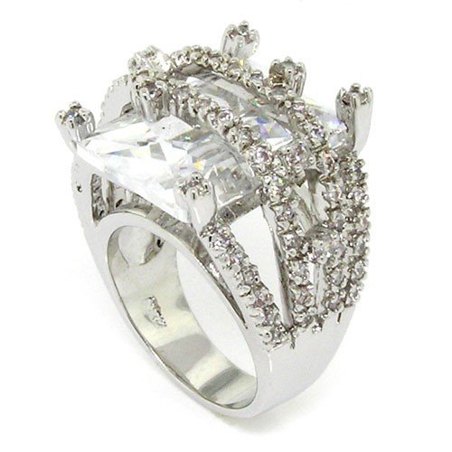 A beautifully wrapped little package with "Diamond"-clad silvery ties drawn over the solitaire! The rectangular stone is a cross-cut sparkling White Topaz CZ measuring approx. 18x13mm. Originating from the shoulders narrow "strings", pavé with small White Diamond CZs and tipped with a prong, reach and secure the 4 corners of the stone. Two more pavé "strings" stretching from shoulder to shoulder lovingly hug the solitaire in a luxurious embrace. And, for that extra designer touch, small prong-set White Diamond CZs are scattered along the twin "strings" and also crown each of the 4 prongs holding the stone. Indeed a superbly crafted package, NOT to be unwrapped! The band is high polished and graduates from approx. 9mm below the shoulders down to 5mm at the back.