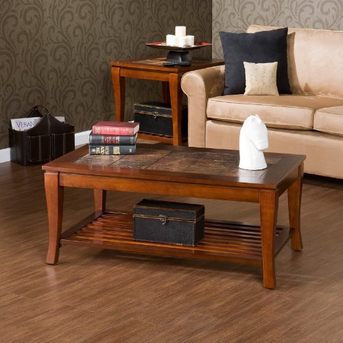 Elegant styling and character bursts from this cocktail table. A magnificent brown cherry finish accents the wood grain and perfectly complements the natural earth tones of the faux slate tile top. Exquisite stone texture adds an amazing rustic feel to this traditional and sophisticated piece. The slat shelf on the bottom creates added visual interest that creates an open feeling. Such a stunning table is sure to be a welcome addition to your home. 42-Inch W by 24-Inch D by 18-1/4-Inch H Brown Cherry Finish Natural Faux Slate Tile Top Slat storage shelf Rubberwood construction Assembly required.