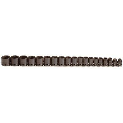 577-72206 Features: -Drive Size: 3/8 in.-No. of Points: 6.-Drive Type: Square.-Opening Size: 6 mm, 7 mm, 8 mm, 9 mm, 10 mm, 11 mm, 12 mm, 13 mm, 14 mm, 15 mm, 16 mm, 17 mm, 18 mm, 19 mm, 20 mm, 21 mm, 22 mm, 23 mm, 24 mm.-Tip Type: Box.-Material: Forged Alloy Steel.-Measuring System: Metric.-Locking Type: Pin.-Quantity: 19 per bar.-Wt.: 1007 g.-Price is for 1 Set. Includes: -Includes: Socket Bar, Socket Clips. Color/Finish: -Finish: Black Oxide.