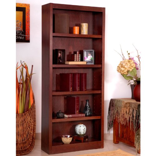 Concepts in Wood Midas collection 72''H five shelf bookcase is constructed of genuine wood veneer laminated to engineered wood with a sturdy plywood back.Bookcase features a sevenstage ecofriendly finish, one fixed and four adjustable shelves, and an unfinished back.Ships ready to assemble.